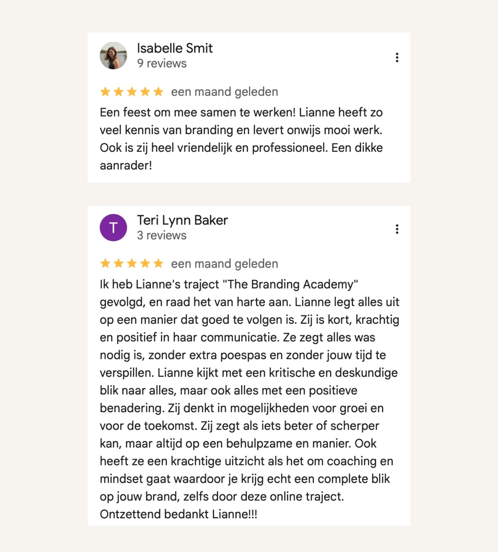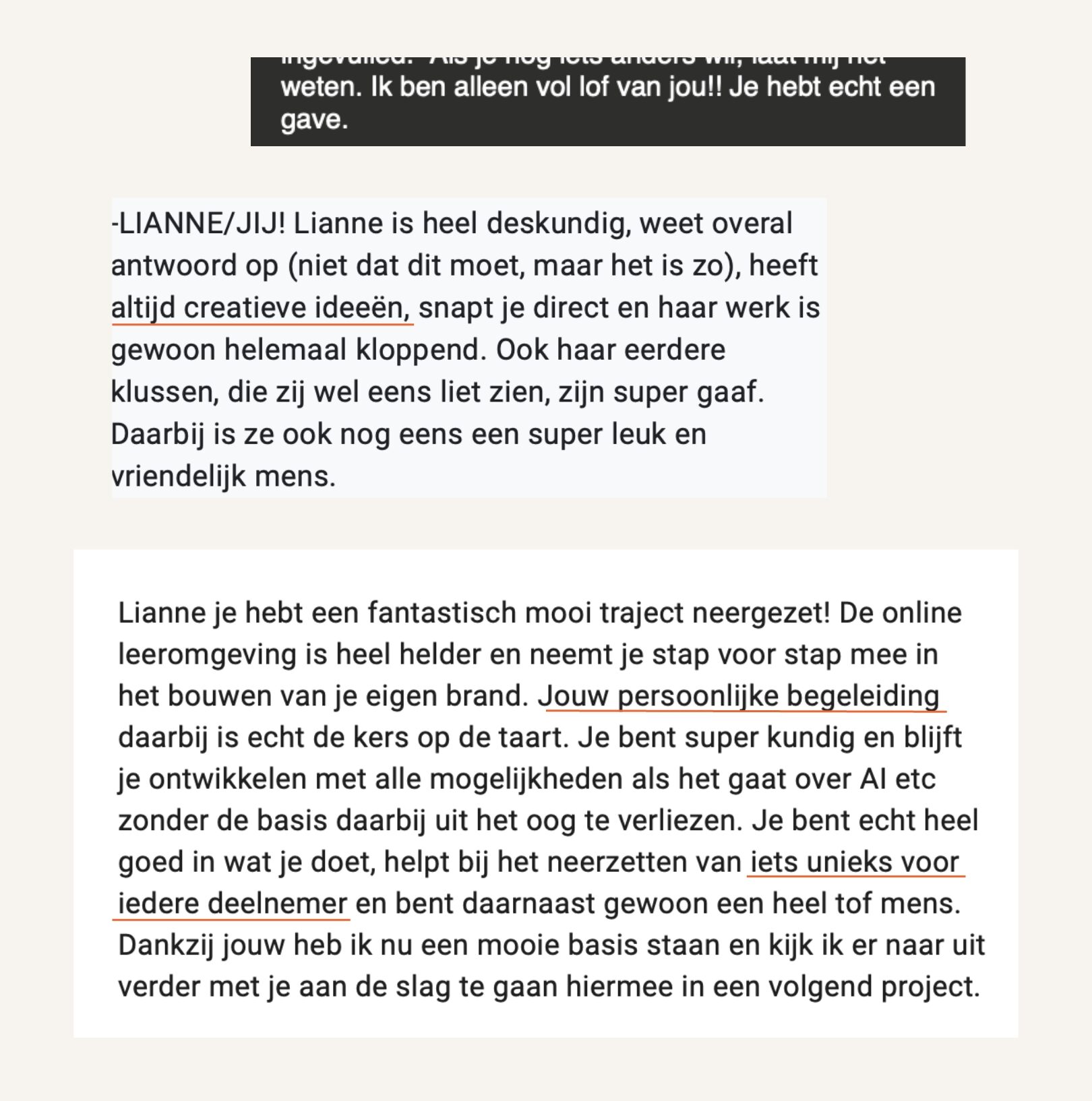 Haar laatste lieve woorden in de review: “Lianne je hebt een fantastisch mooi traject neergezet! De online leeromgeving is heel helder en neemt je stap voor stap mee in het bouwen van je eigen brand. Jouw persoonlijke begeleiding daarbij is echt de kers op de taart. Je bent super kundig en blijft je ontwikkelen als het gaat over AI etc zonder de basis daarbij uit het oog te verliezen. Je bent echt heel goed in wat je doet, helpt bij het neerzetten van iets unieks voor iedere deelnemer en bent daarnaast gewoon een heel tof mens. Dankzij jouw heb ik nu een mooie basis staan en kijk ik er naar uit verder met je aan de slag te gaan hiermee in een volgend project.”